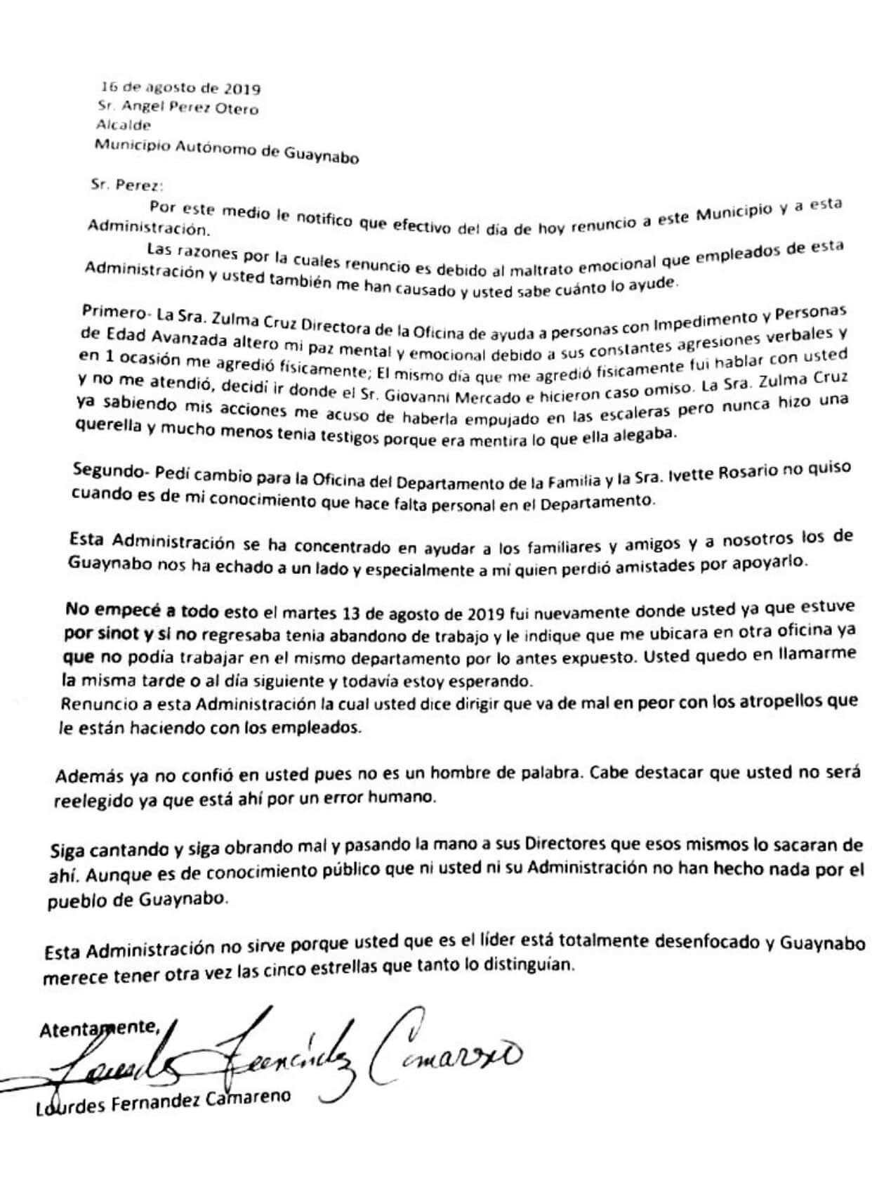 “Esta administración se ha concentrado en ayudar a los familiares y amigos y a nosotros los de Guaynabo nos ha echado a un lado y especialmente a mí quien perdió amistades por apoyarlo. Renuncio a esta administración la cual usted dice dirigir, que va de mal en peor con los atropellos que le están haciendo a los empleados”, escribió en su carta de renuncia Lourdes Fernández Camareno.