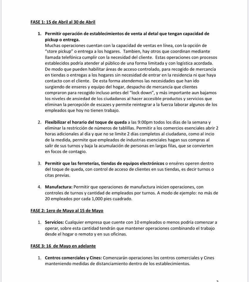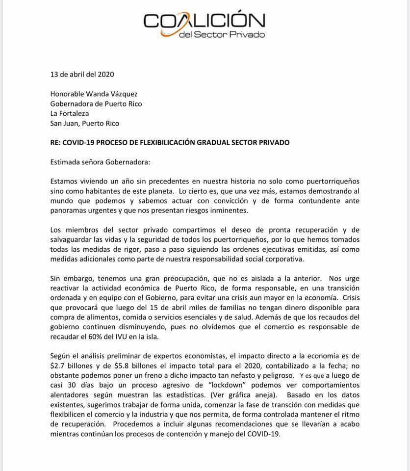 SALA DE REDACCIÓN – La Coalición del Sector Privado, envió una carta a la gobernadora para comenzar un proceso de flexibilización del sector privado en la Isla, tras el toque de queda por la pandemia del coronavirus.